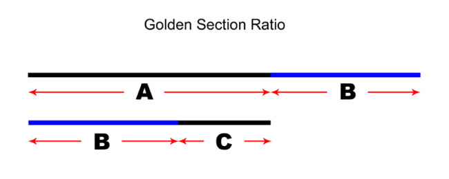 The above diagram shows two lines divided at unique points where the ratio of the whole of line (A) to the large section (B) is the same as the ratio of the large section (B) to the small section (C) but 1.618 times smaller. The division of (A) from (B) is placed in such a way that the ratio of (A) is equal to the ratio of the below line (B+C).